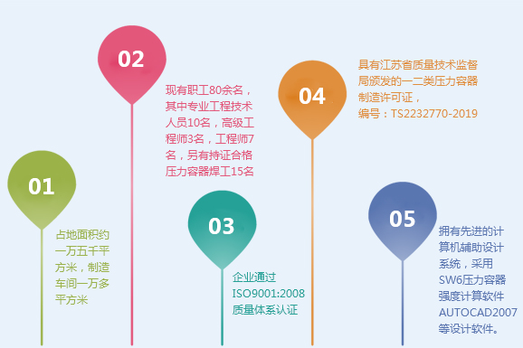 企業具有江蘇省質量技術監督局頒發的一二類壓力容器制造許可證,編號:TS2232770-2019。 擁有計算機輔助設計系統,采用SW6壓力容器強度計算軟件,AutoCAD2007等設計軟件。